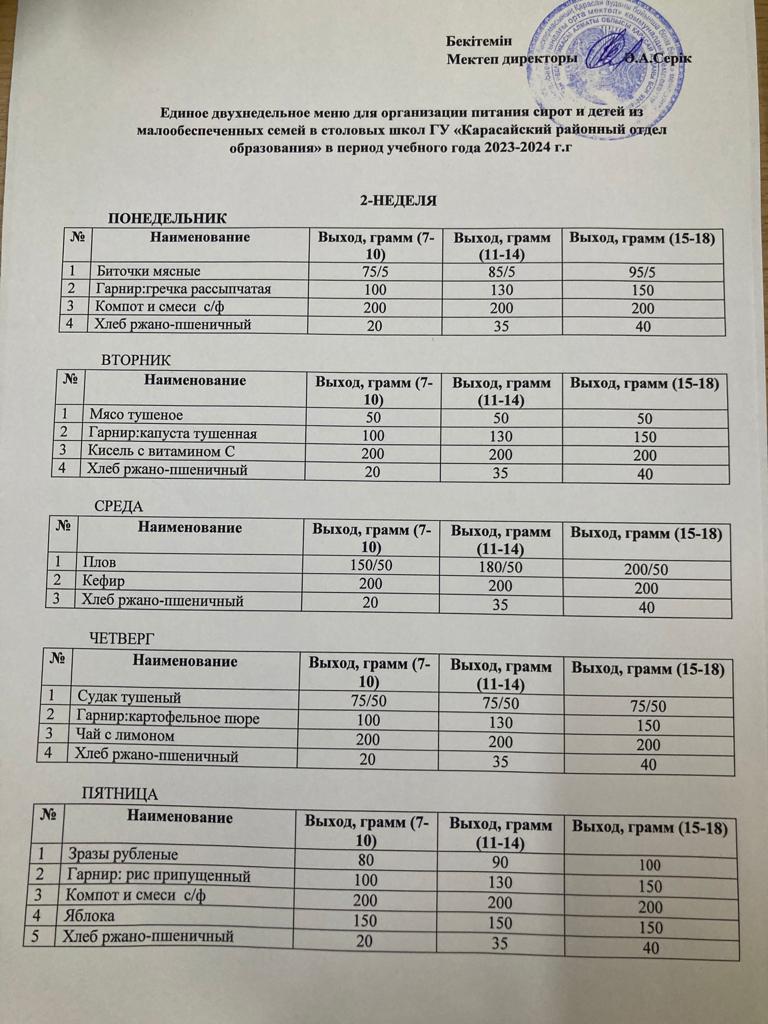 » » "Ә.Байсалбаев атындағы орта мектеп" кмм, ас мәзірі