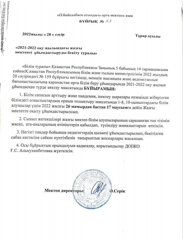 А.Байсалбаев атындағы орта мектеп » Ақпарат » Ә.Байсалбаев атындағы орта мектебінің 2022оқу жылындағы 26мамырдан-17маусымға дейінгі аралықтағы жазғы мектепті ұйымдастыру