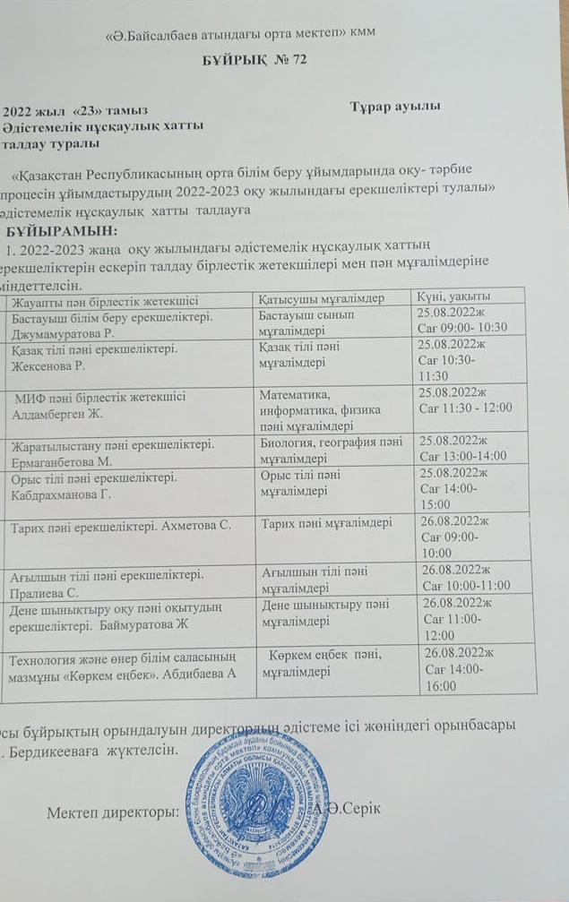 А.Байсалбаев атындағы орта мектеп » Ақпарат » ҚАЗАҚСТАН РЕСПУБЛИКАСЫНЫҢ ОРТА БІЛІМ БЕРУ ҰЙЫМДАРЫНДА ОҚУ-ТӘРБИЕ ПРОЦЕСІН ҰЙЫМДАСТЫРУДЫҢ 2022-2023 ОҚУ ЖЫЛЫНДАҒЫ ЕРЕКШЕЛІКТЕРІ ТУРАЛЫ» ӘДІСТЕМЕЛІК НҰСҚАУ ХАТЫН пән мұғалімдері өз бірлестігіндегі мұғалімдерімен тамыздо отырыстар өткізілді
