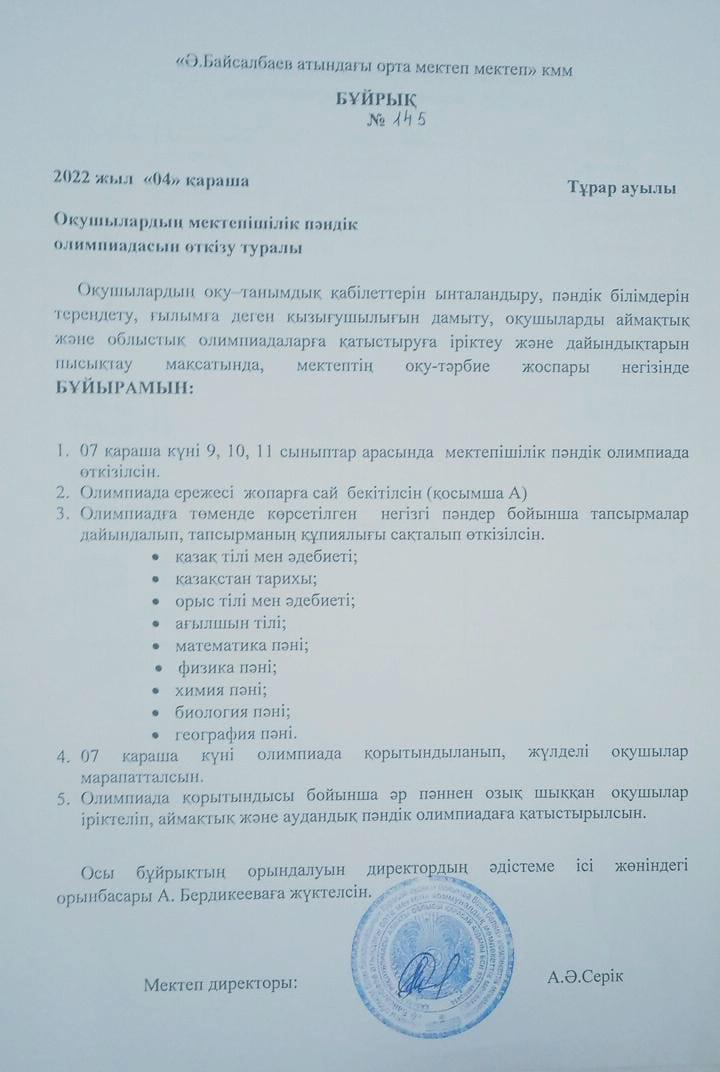 07.11.2022 жылы Ә.Байсалбаев атындағы орта мектепте 9, 10, 11 сыныптар арасында мектепшілік пәндік олимпиада өткізілді. Мектепшілік олимпиада кезеңінен жүлделі оқушылар аудандық кезеңге өтеді » А.Байсалбаев атындағы орта мектеп