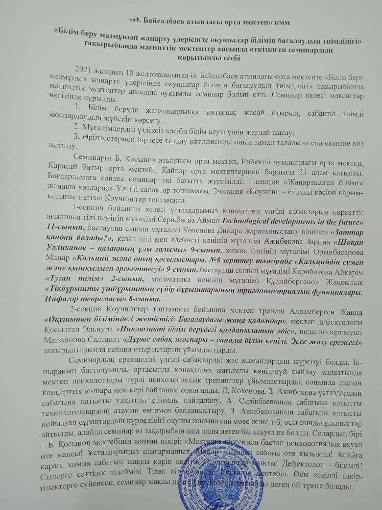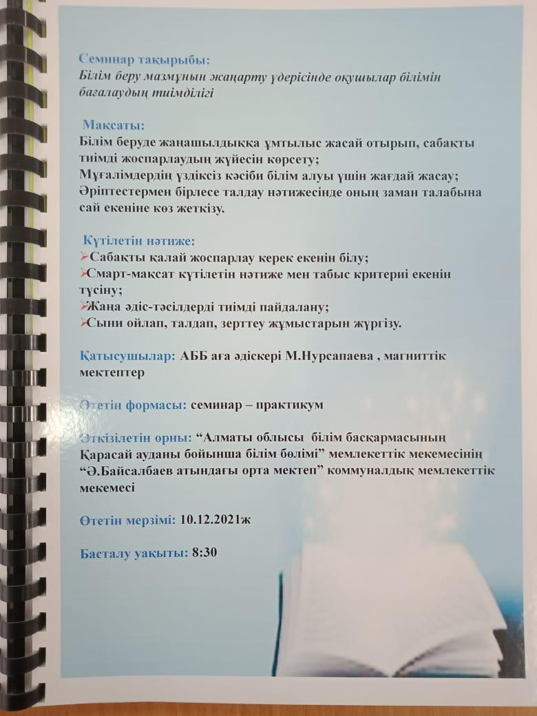 "Білім беру сапасын арттыру және тиімді жұмыс істеу режимі" жобасында Ә. Байсалбаев атындағы орта мектебінде " Білім беру мазмұнын жаңарту үдерісінде оқушылар білімін бағалаудың тиімдігі" тақырыбында аудандық семинар өткізілді. » А.Байсалбаев атындағы орта мектеп