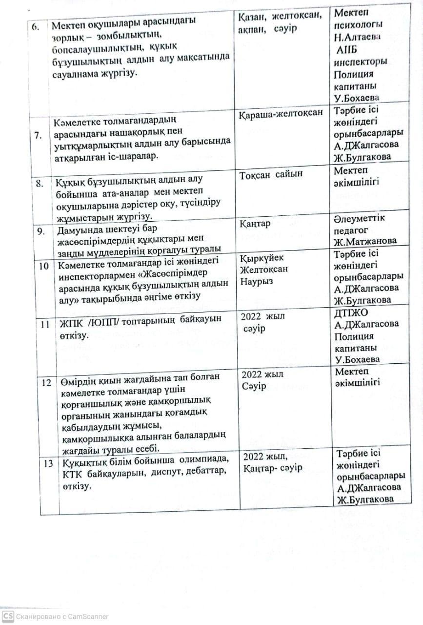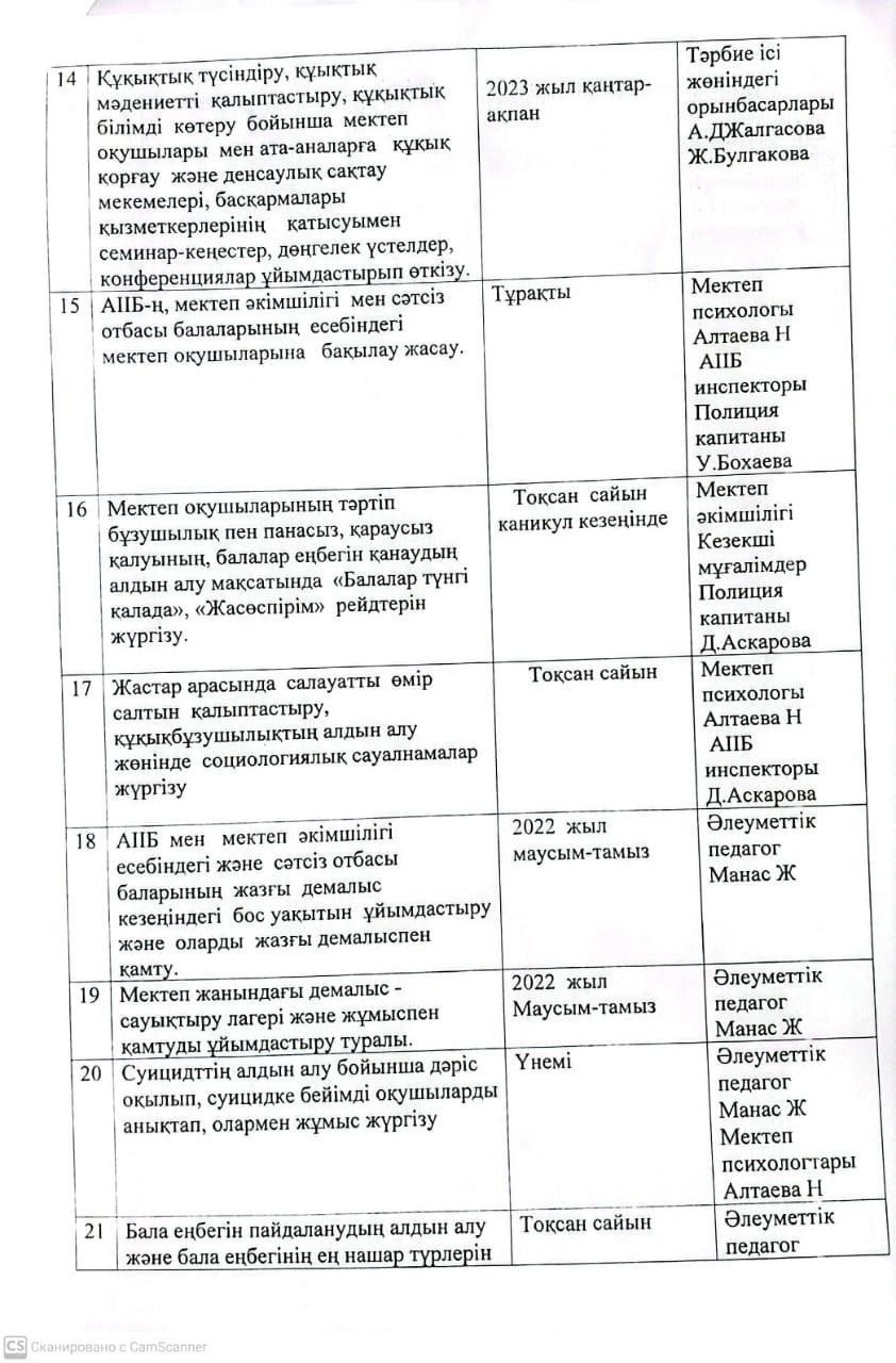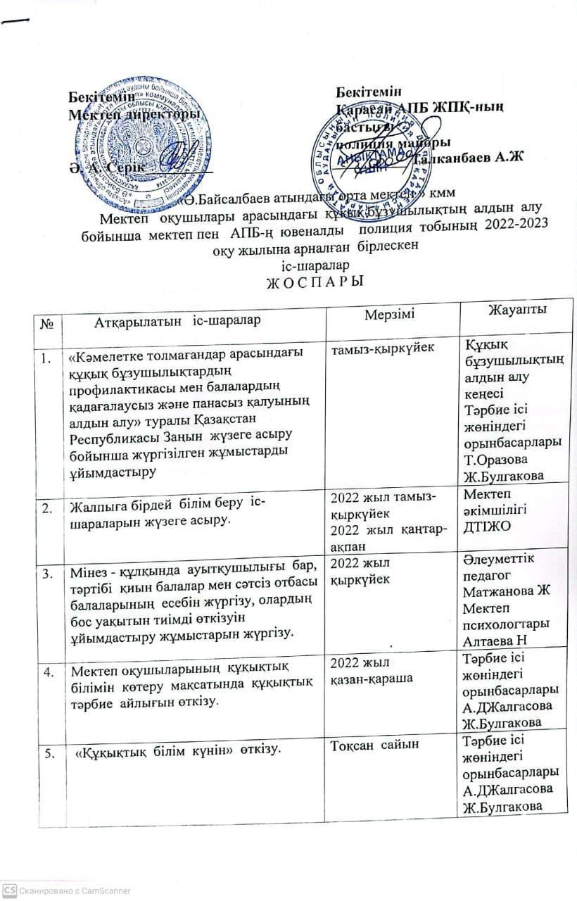 А.Байсалбаев атындағы орта мектеп » Іс-шаралар » “Ә.Байсалбаев атындағы орта мектеп”оқушылары арасындағы құқық бұзушылықтың алдын-алу бойынша мектеп пен АПБ-ның ювеналды полиция тобының 2022-2023 оқу жылына арналған бірлескен іс-шаралар