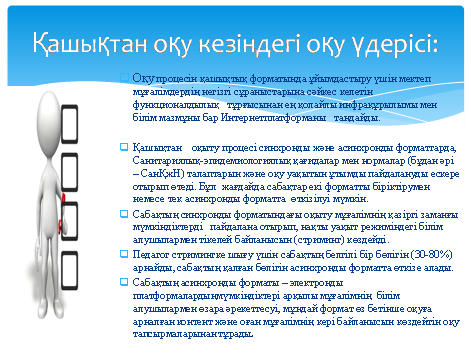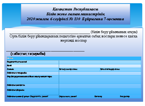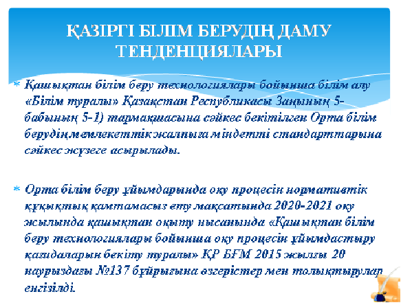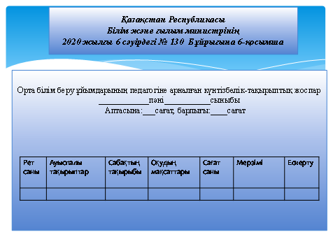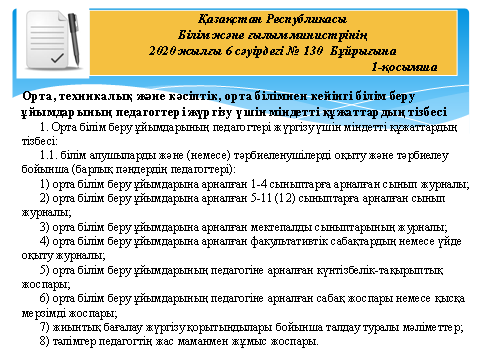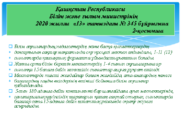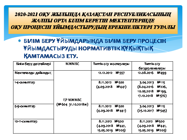10 сентябрь 2020 0 1 2 3 4 5 2020-2021 ОҚУ ЖЫЛЫНДА ҚАЗАҚСТАН РЕСПУБЛИКАСЫНЫҢ ЖАЛПЫ ОРТА БІЛІМ БЕРЕТІН МЕКТЕПТЕРІНДЕ ОҚУ ПРОЦЕСІН ҰЙЫМДАСТЫРУДЫҢ ЕРЕКШЕЛІКТЕРІ ТУРАЛЫ