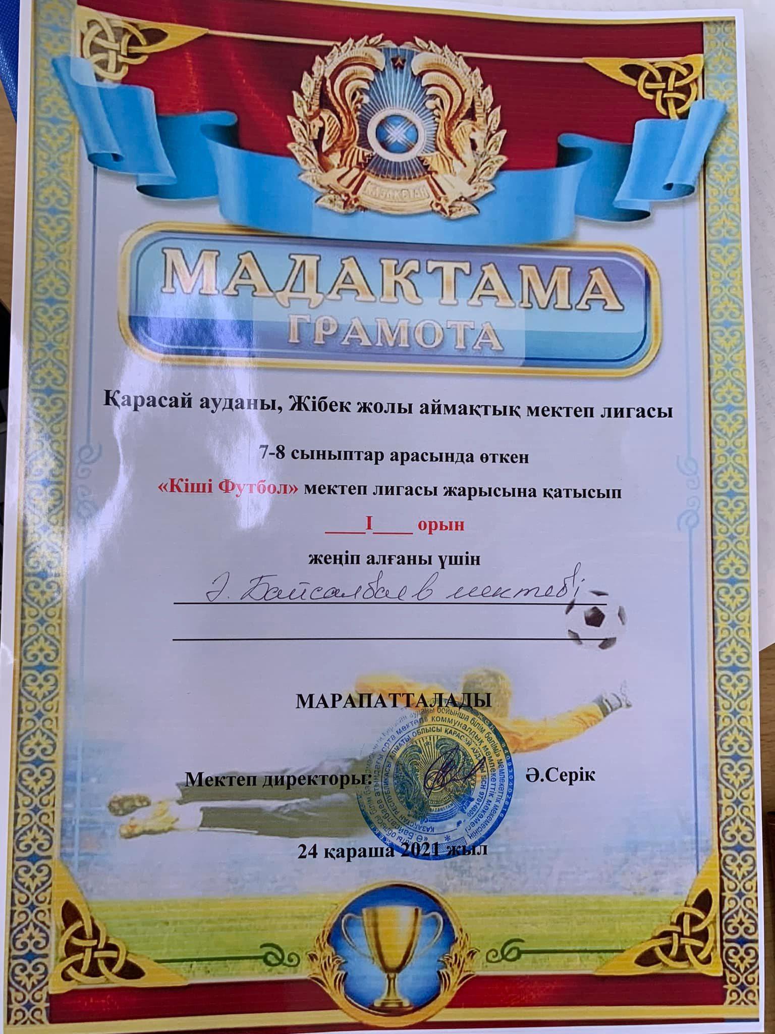 А.Байсалбаев атындағы орта мектеп » Біз туралы » Жетістіктеріміз » Қарасай аудандық, Жібек жолы аймақтық мектеп лигасы 7-8 сыныптар арасында өткен “Кіші Футбол” мектеп лигасы жарысына мектеп оқушыларымыз қатысып l орын жеңіп алды! Құттықтаймыз!!!