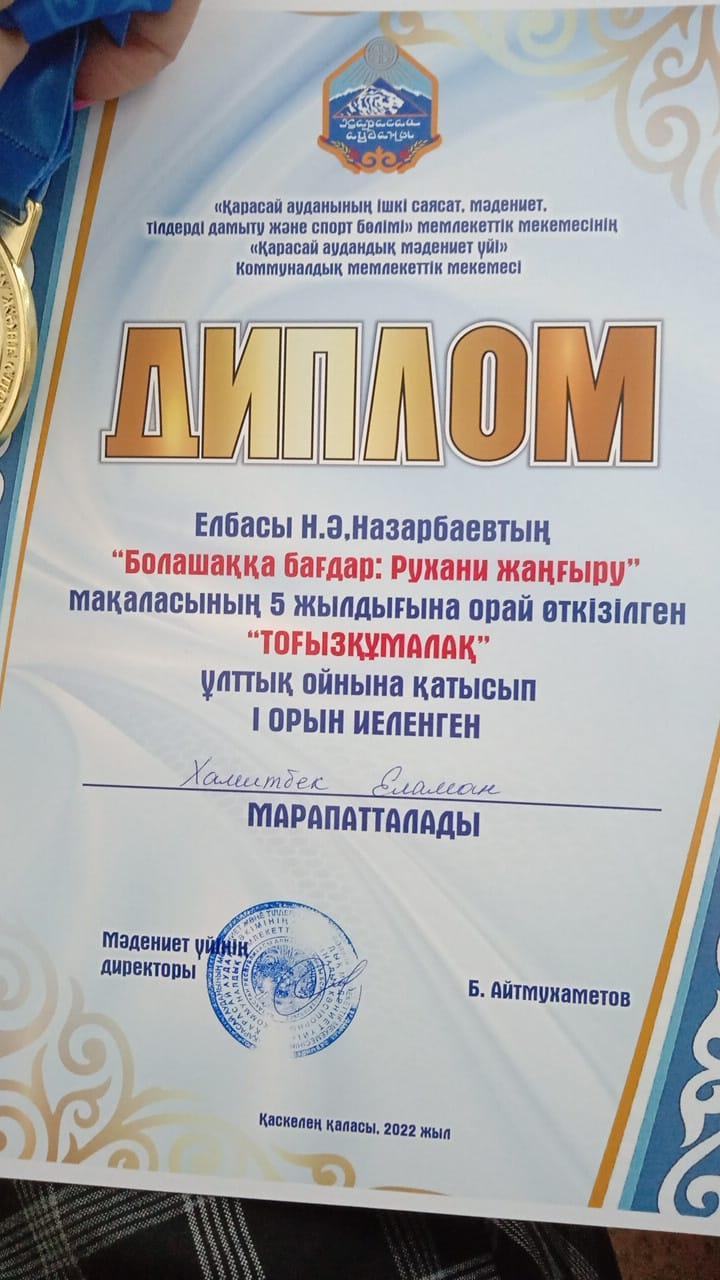 А.Байсалбаев атындағы орта мектеп » Біз туралы » Жетістіктеріміз » Ә.Байсалбаев орта мектебінің дене шынықтыру пәнінің мұғалімі Хамитбек Еламан Елбасы Н.Ә. Назарбаевтың "Болашақ бағдар :Рухани жаңғыру " мақаласының 5жылдығына орай өткізілген "Тоғызқұмалақ"ұлттық ойнына қатысып I-орын иеленді