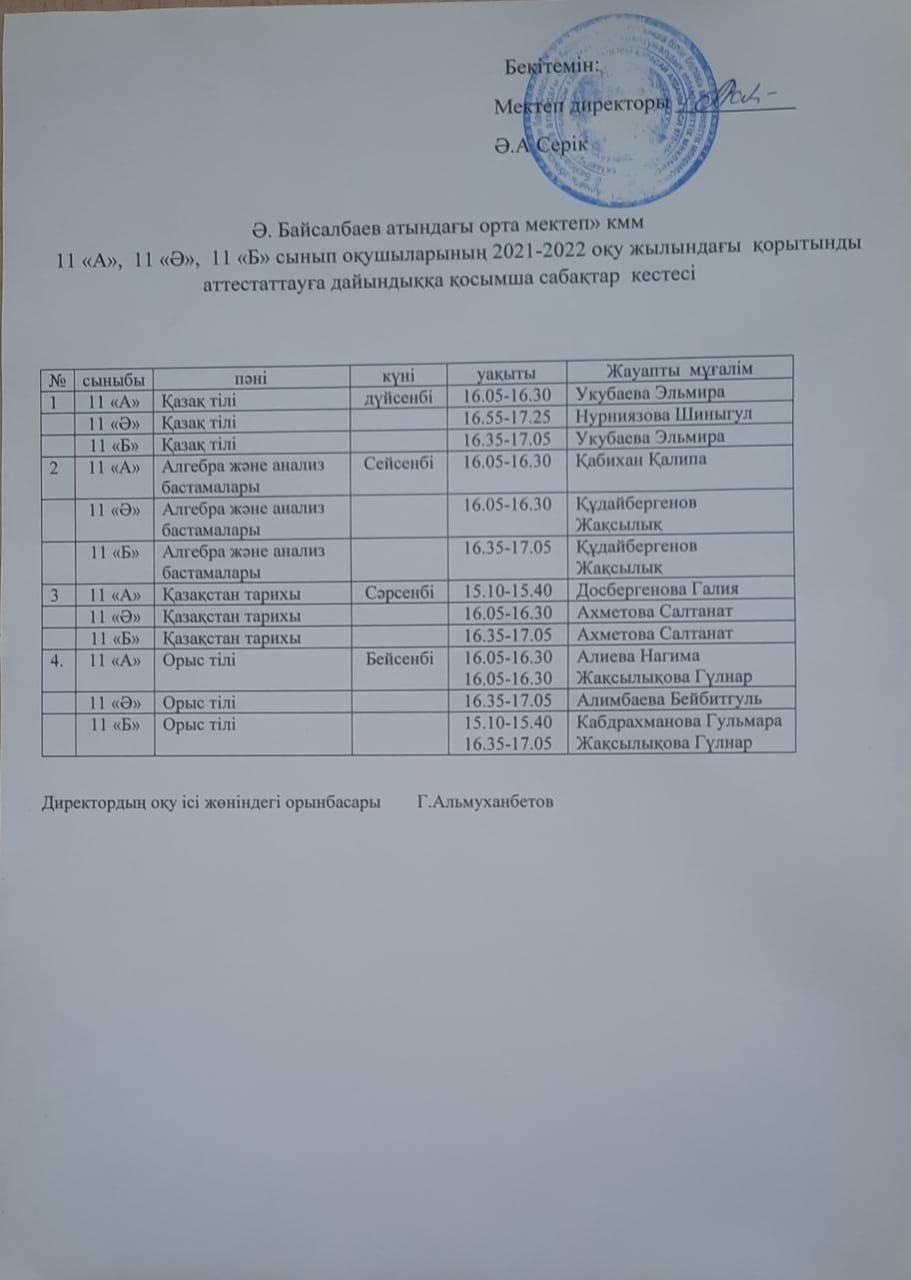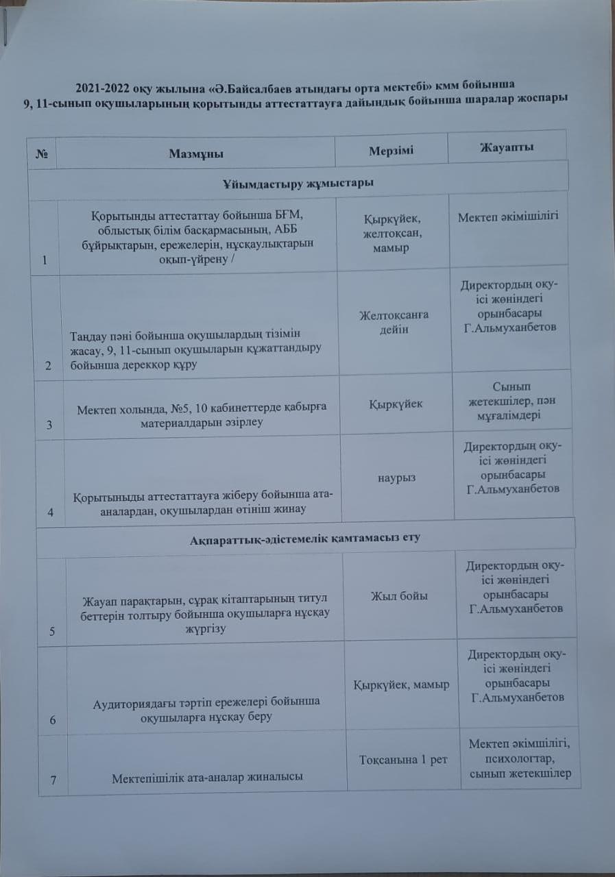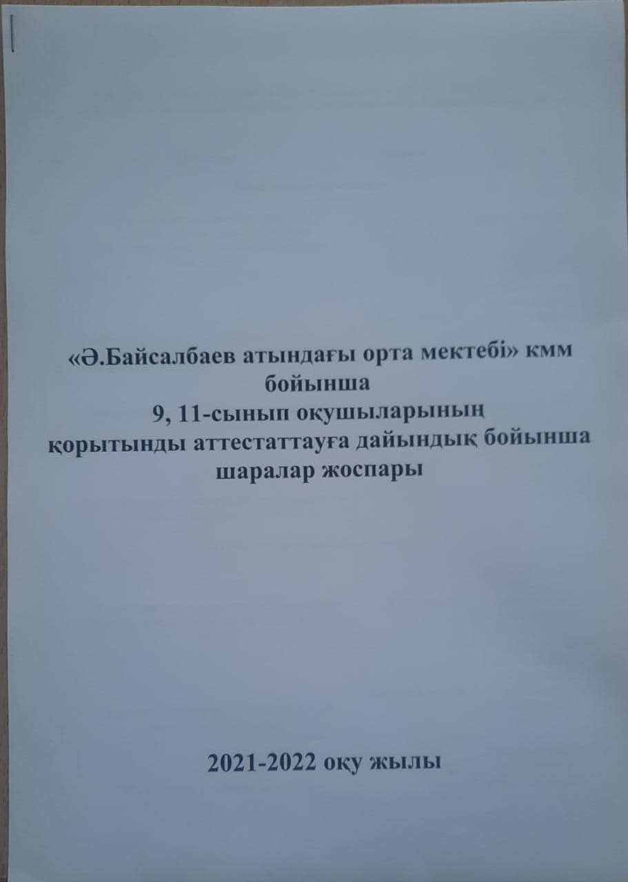 20 апрель 2022 0 1 2 3 4 5 "Ә.Байсалбаев атындағы орта мектебі" кмм бойынша 9,11сынып оқушыларының қорытынды аттестаттауға дайындық бойынша шаралар жоспары